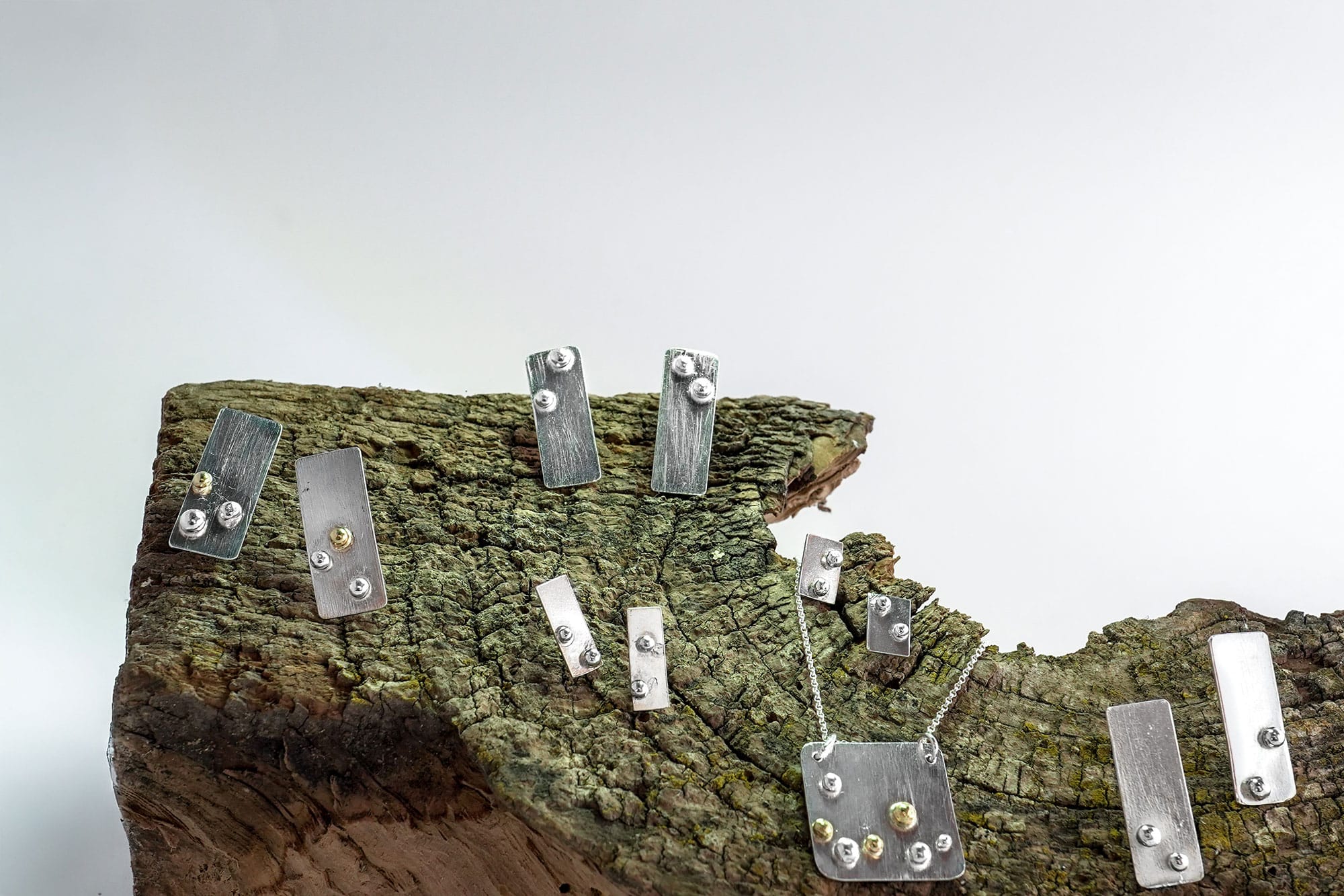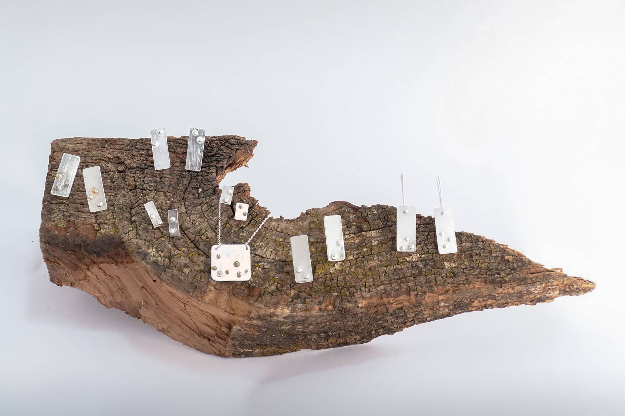 Dentro de la colección Xirimiri, esta pieza ocupa un lugar especial gracias a la combinación de plata de ley y pequeñas gotas de oro reciclado de 18 quilates. Un contraste sutil pero significativo, que aporta calidez y profundidad a la composición sin perder su carácter sereno.