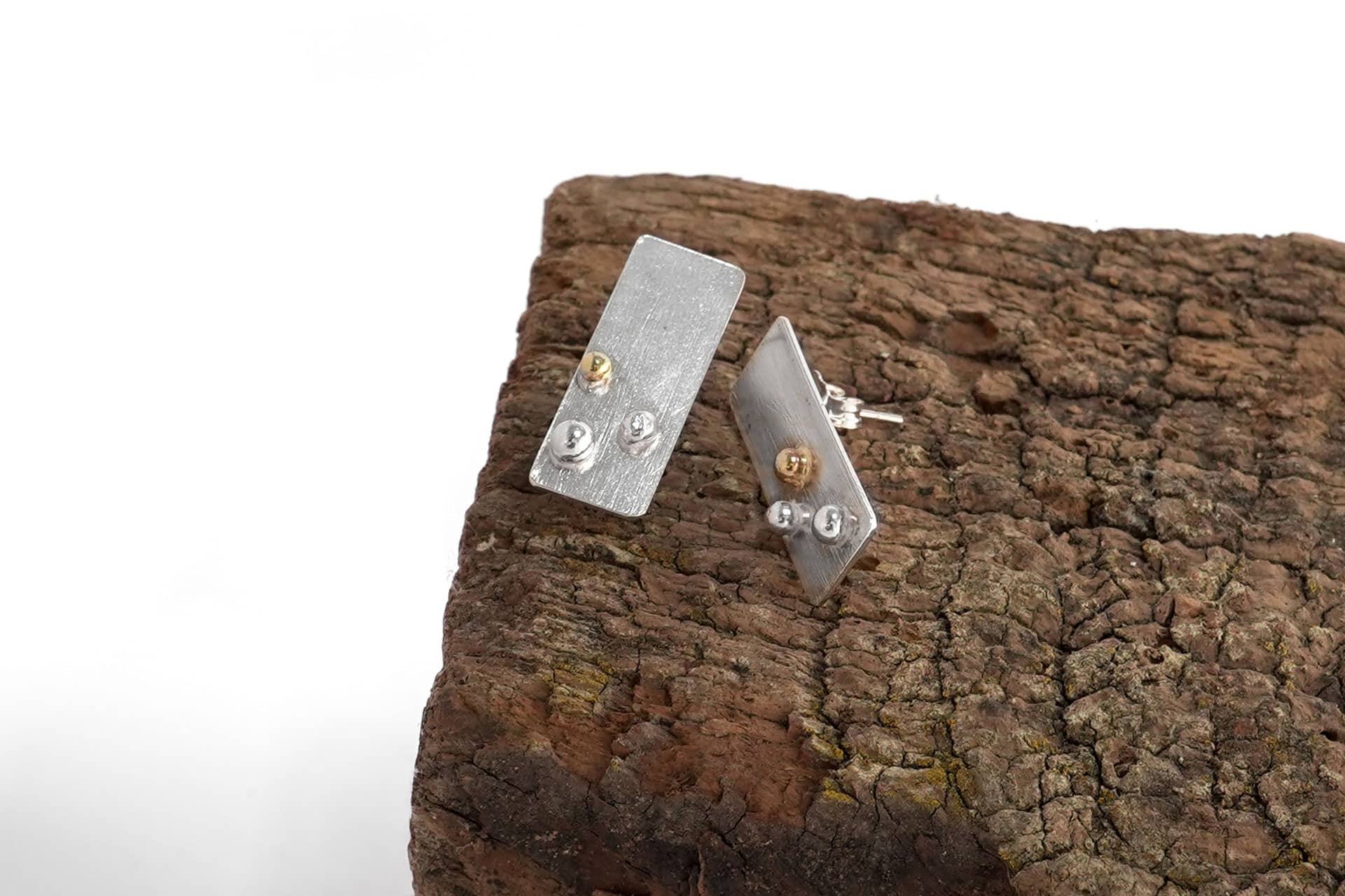 Los pendientes más especiales de la colección Xirimiri, con gotas de plata y oro reciclado de 18k sobre base geométrica texturada.